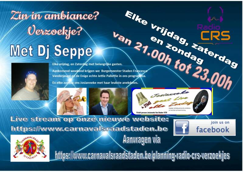 onze live radio & videostream tijdens de weekends op https://www.carnavalsraadstaden.be/planning-radio-crs-verzo….